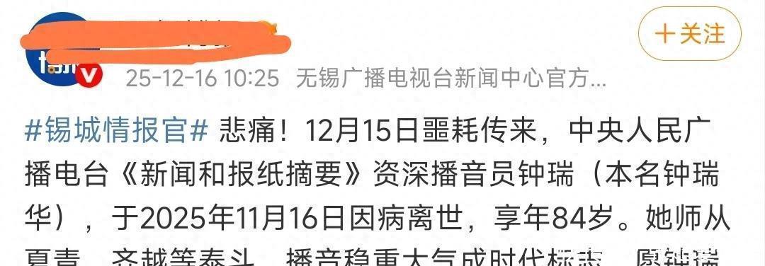 因疾病缠身,医治也未能挽回生命,他在11月16日那天永远地告别了我们,终年84岁。或许年纪轻一些的朋友没怎么听说过“钟瑞”这个名字但若说到中央人民广播电台那档《新闻和报纸摘要》节目那可是好几代人清晨时分的共同回忆钟瑞老师担任这档节目的头号主播,在麦克风前一坐就超过了三十年。她说话字音精准、腔调圆润,声音沉稳又有气场,早就是当时大家心里的“规范好声音”。是许多人晨起时听到的首个声音,像初升的阳光。